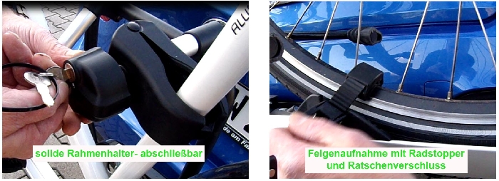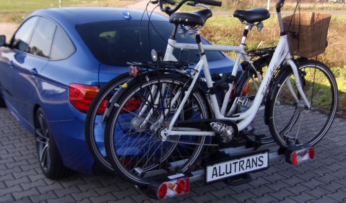 Empfehlung: Mit dem ALUTRANS Impuls Premium Sport erhalten Sie den sicheren und kompakten Heckträger für 2 Sport-Fahrräder und auch alle gängigen Sport-E-Bikes. Der Heckträger ist mit einem abschließbarem Schnellverschluss auf der Anhängerkupplung innerhalb weniger Sekunden verriegelt. Mit max. 60kg Nutzlast können das Elektrofahrrad auch ohne Entnehmen des AKKU problemlos transportiert werden. Durch den erhöhten Abstand der Fahrrad- Aluminiumschienen von ca. 23cm zwischen den E- Bike ist eine Berührung nahezu ausgeschlossen- durch die neue keilförmig gesicherte Felgen- Ratschenverschluss (mit ca. 20mm Gummierung für schonenden Druck auf den Felgen) wird die seitliche Bewegung perfekt unterbunden. Die abschließbaren Fahrrad-Rahmenhalter mit starker Gummierung und Ratschen- Verschluss sorgen auch bei dicken und unförmigen Rahmen für einen schonenden, gut justierbaren und sicheren Halt. Die solide, leicht zu bedienende Abklappfunktion des Heckträgers erlaubt bei vielen Fahrzeugen, auch beladen noch ein Öffnen des Kofferraums. Bei Nichtgebrauch kann dieser Heckträger mit 3 kurzen Handgriffen innerhalb von 3 Sekunden auf ein minimales Packmaß zusammengefaltet werden- eine praktische Tasche zum Verstauen liegt dem Lieferumfang kostenlos bei. Das Eigengewicht von nur ca. 17 kg erlaubt eine hohe Zuladung und ein leichtes Aufsetzen auf die Anhängerkupplung. Die über den Schnellverschluss automatisch waagerechte Ausrichtung auf der Anhängerkupplung sorgt für eine leichte und komfortable Befestigung auf der Anhängerkupplung- in Sekundenschnelle. (als Zubehör ist auch eine Beladeschiene Art. 2519115 erhältlich) ABE und 13pol. Steckersystem sind enthalten. + Der Qualitäts-Heckträger mit geringem Eigengewicht, hoher Nutzlast, Schnellverschluss und komplettem Diebstahlschutz- zusätzlich zusammenfaltbar+ alle Pluspunkte in einem Heckträger. Dieser Heckträger wird von uns komplett vormontiert geliefert - und ist somit sofort einsatzbereit. Geeignet auch für E- Bike mit größerem Radstand bis 1,35m (teilweise bei Gazelle und bei E- Bike mit dem Akku vor dem Hinterrad erforderlich). Bei Fragen beraten wir Sie gern. Dieser Heckträger ist auch für Anhängerkupplungen bzw. Kugelstangen mit Sicherheitsstift / Pin geeignet.