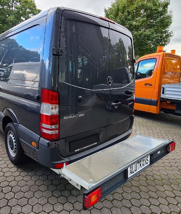 Plattformträger für den Mercedes Sprinter (bis max. 5,93m Fahrzeuglänge, max. Überhang 1,24m) 4er Bj. 2006-2018 mit AHK. Die Aluminiumplattform, kpl. incl. dem nötigen Grundträger KALUX und Fahrzeugadapter ist die ideale Lösung für alle, die Lasten von max. 200kg (je nach freier Hinterachslast) mit Ihrem Wohnmobil mitnehmen wollen. Grundträger, Plattform und Lichtleiste in Aluminium eloxiert. Abmessungen der Plattform ca. 1800x 400 mm: Gewicht des Trägers ohne Aufnahmeelemente ca. 37 kg. Lieferumfang: Kpl. Heckträger mit d. Plattform, incl. Beleuchtung, Fahrzeuganbindung (Aufnahmeelemente-Standard für dieses Kastenfahrzeug somit kann dieser Heckträger auch sehr schnell und einfach bei Nichtbedarf abgenommen werden). TüV-eintragungsfrei. Die Lichtleiste und Plattform kann optisch abweichen, da diese stets in aktuellster Ausführung geliefert werden. Gern beraten wir Sie. Bitte beachten Sie, nicht jede Anhängerkupplung ist kompatibel- wir bitten Sie, uns zur Bestellung, alle Angaben lt. Typenschild zu übermitteln. Zubehör auf Wunsch separat zu bestellen.