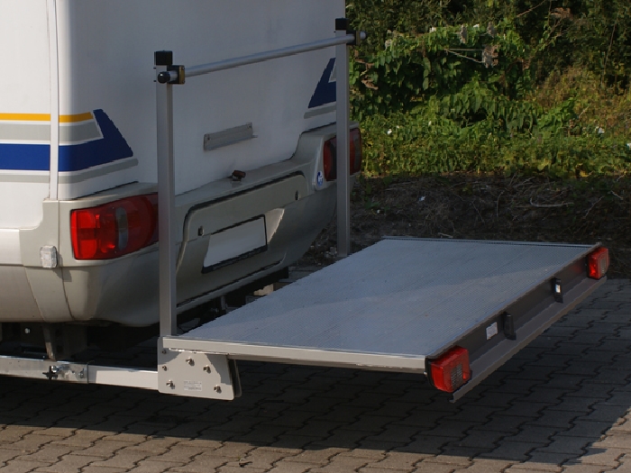 Alle Möglichkeiten--Die Aluminiumplattform, kpl. incl. dem nötigen Grundträger premium und Fahrzeugadapter für den Renault Master Bj. 2003-2010 mit AHK, ist die ideale Lösung für alle, die Lasten bis 200kg mit Ihrem Wohnmobil mitnehmen wollen. Grundträger, Plattform und Lichtleiste in Aluminium eloxiert. Abmessungen der Plattform ca. 1800x 850 mm: Gewicht des Trägers ohne Aufnahmeelemente ca. 37 kg. Lieferumfang: Kpl. Heckträger mit d. Plattform, incl. Beleuchtung, Fahrzeuganbindung an den Hauptrahmen für dieses Kastenfahrzeug (somit kann dieser Heckträger auch sehr schnell und einfach bei Nichtbedarf abgenommen werden)..- TüV- eintragungsfrei. (Die Lichtleiste und Plattform kann optisch abweichen, da diese stets in aktuellster Ausführung geliefert werden.) Gern beraten wir Sie. Bitte beachten Sie, nicht jede Anhängerkupplung ist kompatibel- wir bitten Sie, uns zur Bestellung, alle Angaben lt. Typenschild zu übermitteln. Zubehör (auf Wunsch separat zu bestellen): Diebstahlsicherung zur Sicherung des Lastenträgers am Wohnmobil/ Kastenfahrzeug, Artikelnr: 2887496.